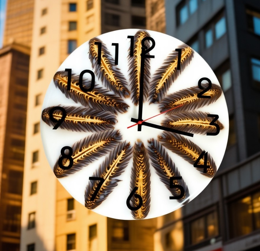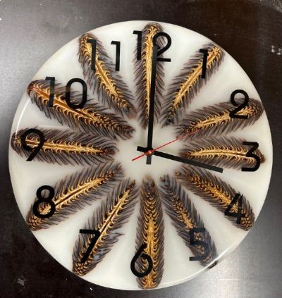 Sur commandeHorloge en résine avec 12 pives d'épicéa coupées pour la décoration sur fond blanc