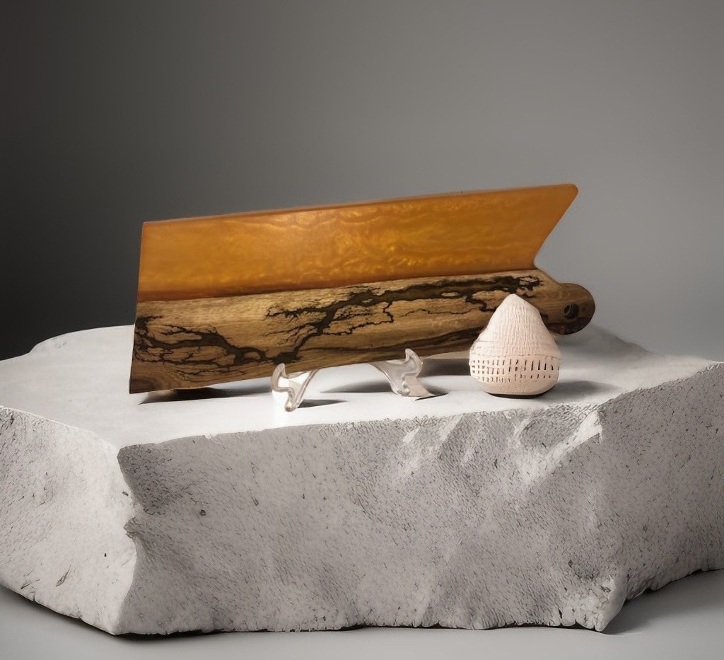Planchette en bois avec de la résine orangée et en effet foudre comblé par de la résine dorée
