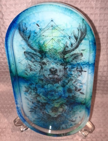 plateau en résine allongé bleu-vet avec une tête de cerf