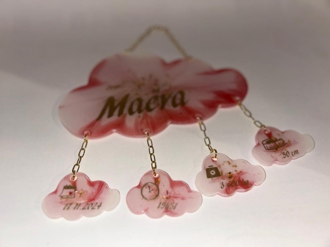 Portique de naissance en forme de nuage.Sur le grand nuage inscription du prénom sur les petits nuage:- la date de naissance- l'heure de naissance- la taille du bébé- le poids de naissance